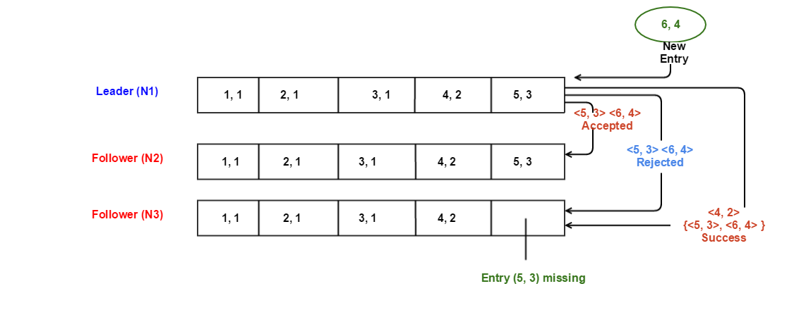 - N1 sends AppendEntry RPC to N3 with data as <5, 3> and <6, 4>. Consistency check fails as the last entry in N3 is <4, 2> and not <5, 3>. N3 sends back the rejection to N1.